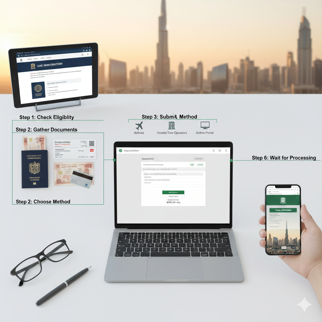 Online via the UAE Government Portal: The Federal Authority for Identity and Citizenship (ICA) provides an e-visa system for easy online submission.