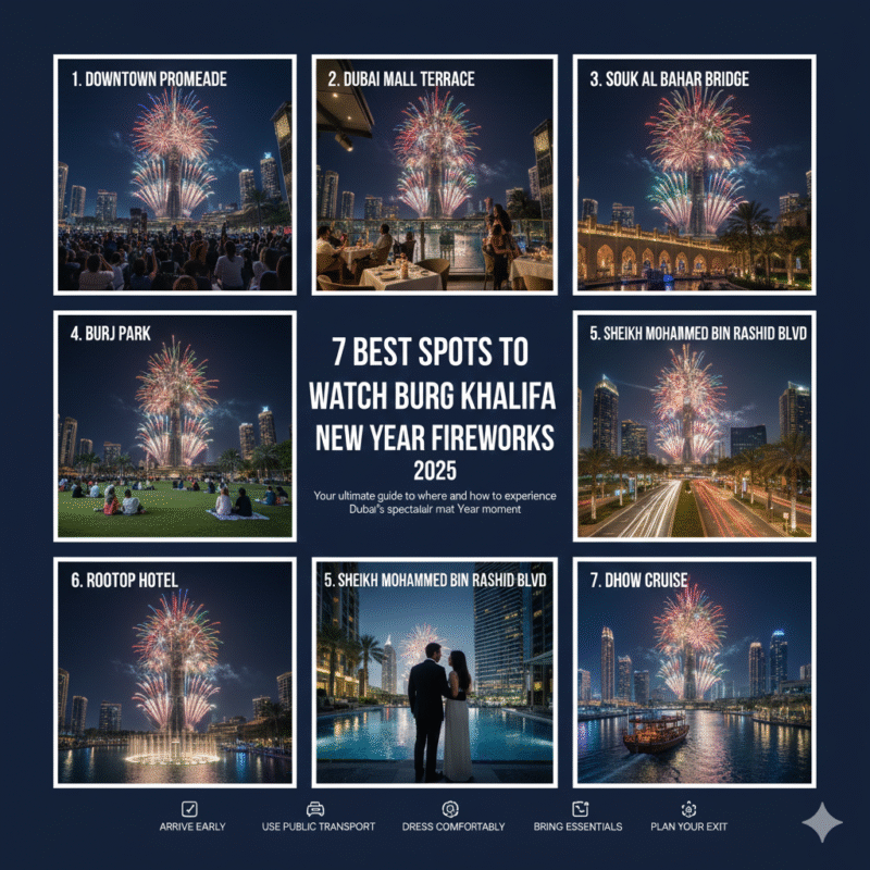 The Burj Khalifa New Year fireworks are more than a show — they’re a celebration of life, energy, and new beginnings. Whether you choose the heart of Downtown, a peaceful park, a restaurant terrace, or a scenic boat cruise, each spot offers a different way to enjoy Dubai’s biggest night of the year.